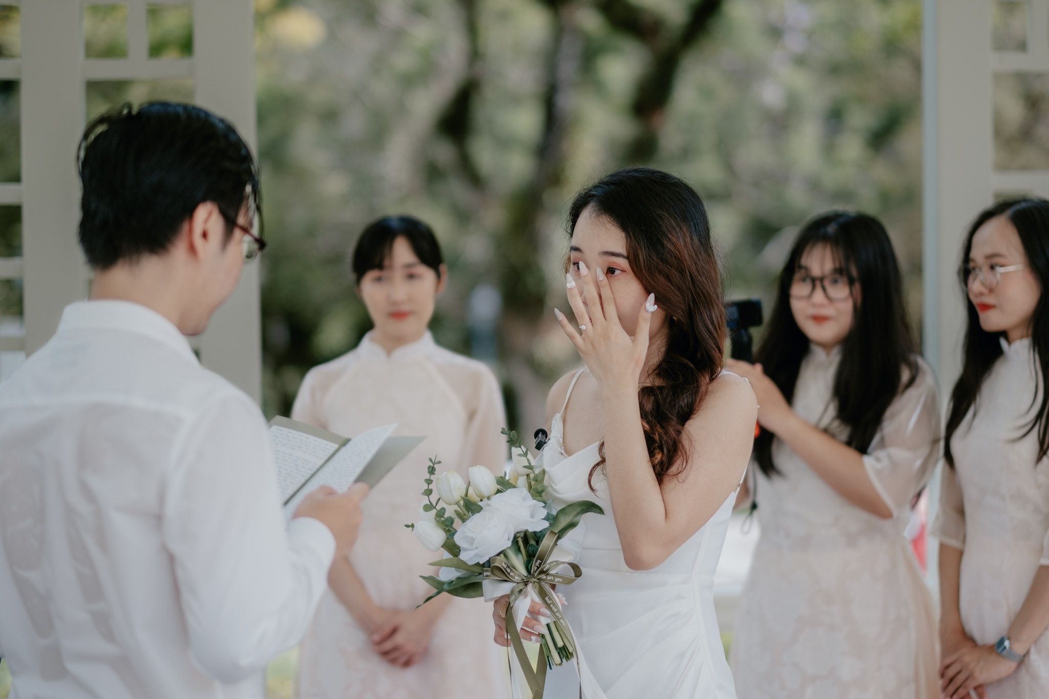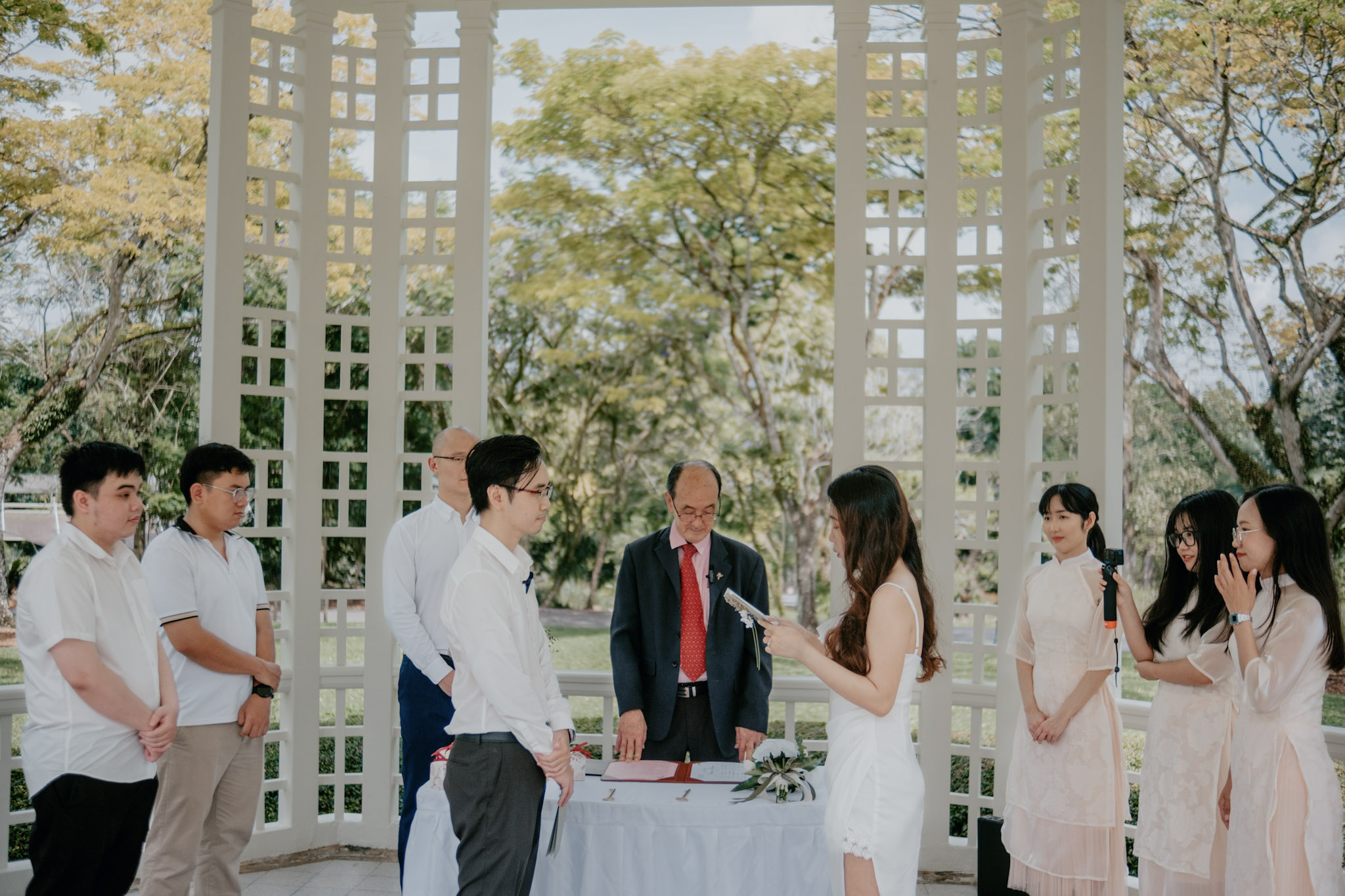 Chúng mình đã có buổi đăng ký kết hôn trong mơ. Vào một sáng trời trong veo, giữa khu vườn nhiệt đới 165 năm tuổi, dưới sự chứng kiến của Người Chủ Hôn, gia đình và bạn bè thân thiết, chúng mình cam kết đi cùng nhau đến mãi về sau.